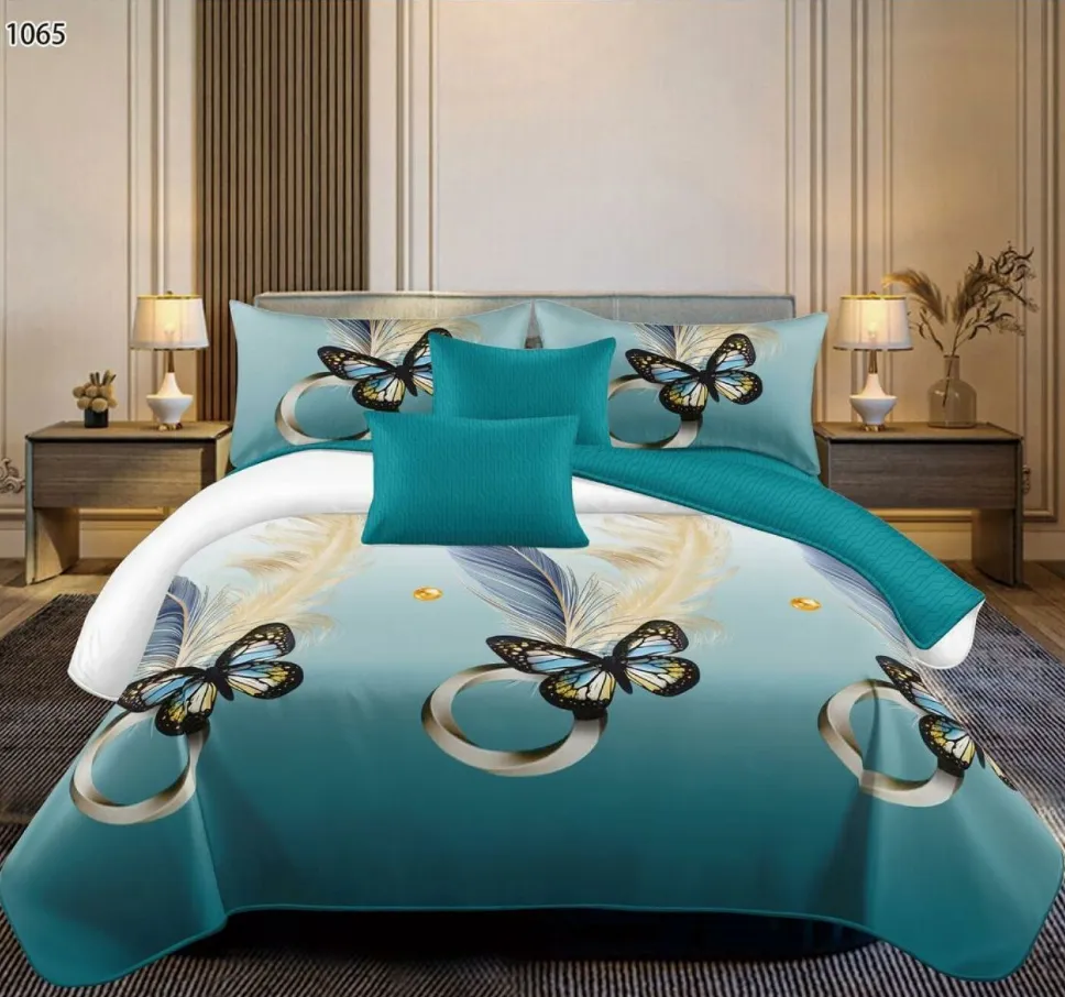 Cu lenjeria Lenjerie de pat Finet 6 piese, turcoaz cu fluturi si inele aurii-LP1065, transformi dormitorul tău într-o oază de confort și rafinament. Acest set complet, format din 6 piese, este creat dintr-un material textil special tratat pentru a-ți oferi o senzație unică de finețe la atingere și o rezistență de lungă durată.