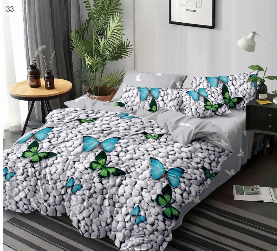Lenjerie de pat Finet 6 piese, alba cu fluturi albastri si verzi-LP33 - Descoperă confortul și rafinamentul oferite de acest set de lenjerie de pat din finet, format din 6 piese. Colecția este realizată dintr-un material textil tratat special, conferind țesăturii o senzație moale la atingere și o durabilitate remarcabilă în timp.