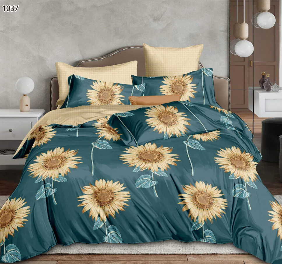 Lenjerie de pat Finet 6 piese, petale galbene cu albastru intens-LP1037 - Descoperă confortul și rafinamentul oferite de acest set de lenjerie de pat din finet, format din 6 piese. Colecția este realizată dintr-un material textil tratat special, conferind țesăturii o senzație moale la atingere și o durabilitate remarcabilă în timp.