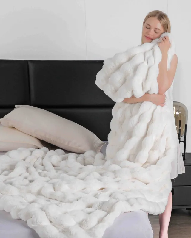 Patura moale tip cocolino din material pufos si catifelat cu blana artificiala de iepure , ce poate fi utilizata atat pentru decor, cat si pentru a te inveli in zilele friguroase.