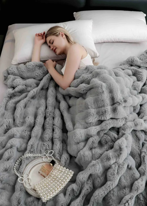 Patura moale tip cocolino din material pufos si catifelat cu blana artificiala de iepure , ce poate fi utilizata atat pentru decor, cat si pentru a te inveli in zilele friguroase.