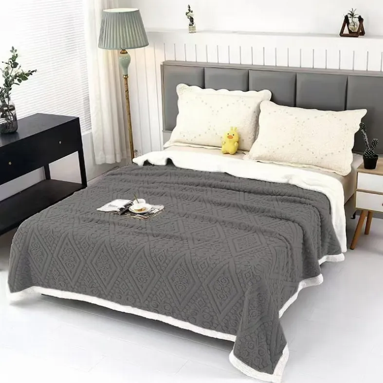 Patura Groasa Cocolino cu Blanita, gri cu romburi texturate si margine alba-NR2 are textura pufoasa si catifelata,o poti folosi atat pentru decor cat si pentru a te incalzi in zilele friguroase. Ideale pentru a inlocui atat pilotele grele care incalzesc greu, dar si cearsafurile subtiri si rigide. Paturile cocolino sunt extrem de pufoase si calduroase nu sunt grele.