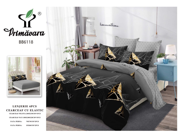 PRIMAVARA Lenjerii de pat Finet 6 piese cu Elastic,Negru cu piramide aurii-FEL407